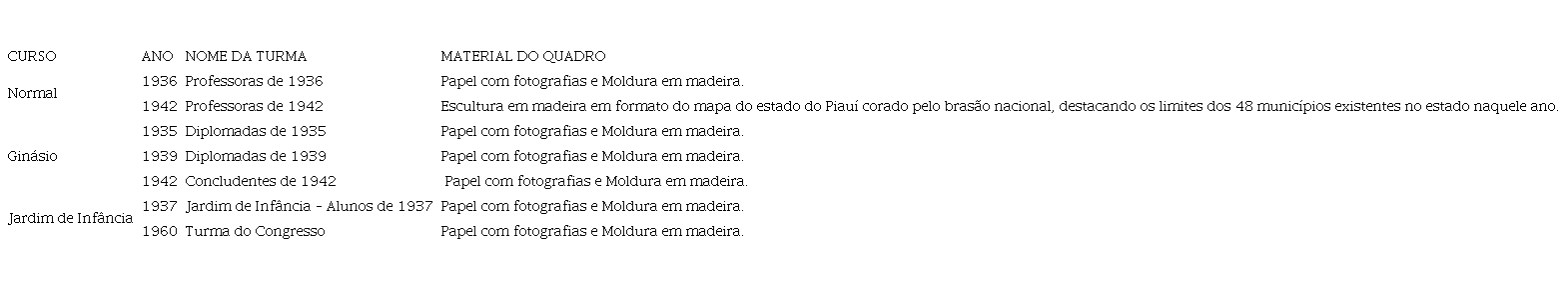Percebemos o trabalho de dedicação e detalhismo do artesão ao talhar a peça que se tornaria um quadro de formatura. Tomemos como exemplo o quadro de formatura da Turma de 1942 do Curso Normal do Colégio de Teresina, que foi esculpido no formato do mapa do estado do Piauí com todos os limites territoriais dos quarenta e oito (48) municípios que até então o integravam. As fotografias das formandas foram inseridas dentro destes “limites dos municípios”, levando o observador a acreditar que as mesmas estão posicionadas em conformidade com o local de sua naturalidade, posto que há espaços correspondentes a determinados municípios em que há mais de uma foto e outros que foram deixados vazios. A escultura em madeira do mapa é coroada pelo brasão da República fundido em metal, o que denota a superioridade do poder da nação em relação ao poder local.