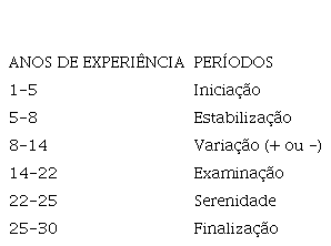 No tocante às fases da carreira, adotamos as fases elencadas por Ferreira (2014), que ilustra a realidade do professorado brasileiro, expressa nos quadros 01 e 02: