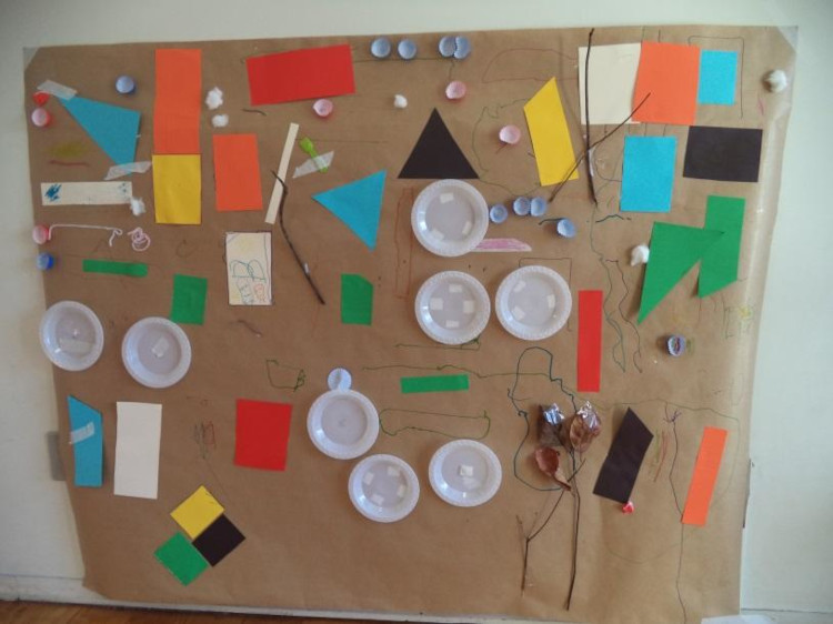 Por último, propusemos a confecção de painel coletivo (Fig.9). Com papel pardo no tamanho de 1m x 1,50m, fixado à parede da sala, e uma caixa com diversos objetos, as crianças foram convidadas a explorarem os materiais e a criar, livremente, um painel sobre a história, a fim de representar aspectos do livro. Todas as crianças se envolveram na confecção da produção coletiva.