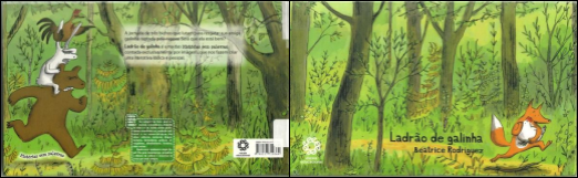 O leitor também pode ter uma prévia noção do cenário pelos elementos presentes na capa. Ao abrir o exemplar e ver a totalidade da capa e da quarta capa (Fig. 2), constatamos mais uma parte da história. Na sequência, os outros personagens correm atrás da raposa que tem a galinha “nas mãos”. Capa e contracapa, nesse caso, antecipam dados do enredo.