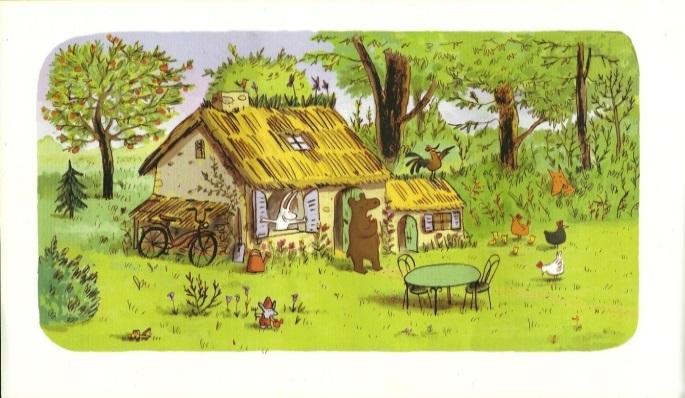 Há uma cena em que a raposa continua a fuga em direção ao mar e os outros personagens não hesitam em persegui-la. Ela apossa-se de um barquinho e começa a remar; a galinha, com óculos de sol, parece estar gostando do passeio. Já o coelho e o galo utilizam o corpo do urso como barco para navegar no mar, e a expressão dos três é de medo frente às ondas. Chegam à praia exaustos e avistam pegadas que levam a uma grande árvore onde fica a casa da raposa e da galinha. Pela janela, no tronco, os três tentam identificar o que há dentro. Entram com expressão de ira, o urso leva um pedaço de lenha na mão para se defender, no entanto, encontram a galinha e a raposa em harmonia, sentadas em frente à lareira, degustando sopa (Fig. 7).
