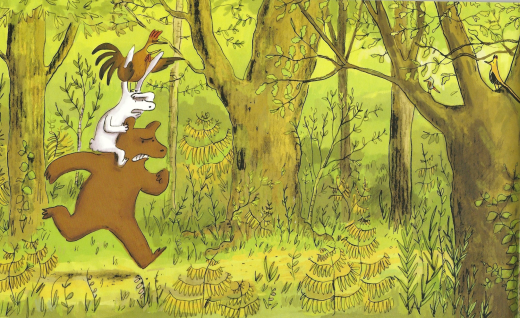 As ações dos personagens, ilustradas com detalhes nas expressões, são observadas pelas crianças. Ao relatar a atuação do coelho, Aquarela deduz que ele ‘disse’ para os demais companheiros irem mais rápido. Na imagem, o coelho aparece puxando o urso pelo braço, como se estivesse incentivando-o a continuar a perseguição. Concluem que os animais ficaram cansados, mas, na página anterior, demonstravam ‘força’. Novamente, a expressão de disposição na corrida para resgatar a galinha demonstra força e determinação dos personagens.