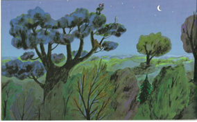 Na página 3 (Fig. 4), também se revela a cor verde em tom mais claro, indicando a luz do dia. Gradativamente, na cena seguinte (Fig. 5), o verde passa a ser mais escuro, sinalizando o anoitecer na mata (Fig. 6).