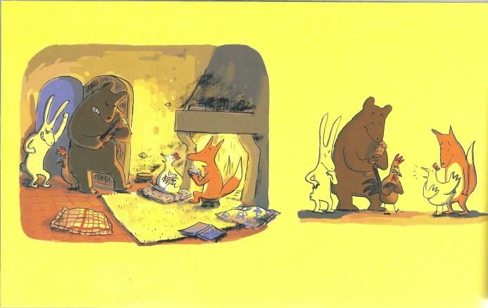 Por fim, o desenlace ocorre no momento em que a galinha tenta explicar a situação e, então, beija a raposa. Em seguida, todos sentam-se ao redor da lareira para tomar sopa – a galinha está no colo da raposa, compartilhando o mesmo prato com expressão de felicidade. O galo não parece estar contente, e o urso mostra-se chateado.