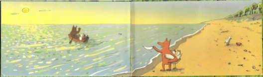 Na última cena, em folha dupla, acontece a despedida, configurando-se o desfecho da narrativa. O urso, o coelho e o galo partem com o barco a remo e acenam para a raposa e a galinha que ficam na praia, satisfeitas. Na ilustração, a raposa volta-se para a esquerda, sugerindo ao leitor a possibilidade de retornar ao início da narrativa, ou seja, há proposição para a releitura da obra. Nessa imagem, o galo mostra-se cabisbaixo, fazendo o caminho de volta em companhia dos seus amigos (Fig. 8).