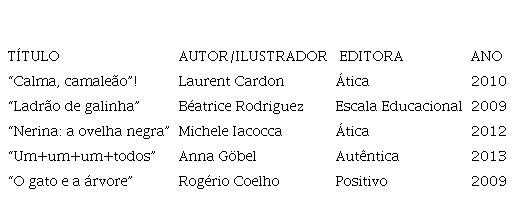 Para a investigação, foram utilizadas cinco obras integrantes do acervo do PNBE 2014, categoria 2 – Educação Infantil – Pré-Escola, conforme quadro 1: