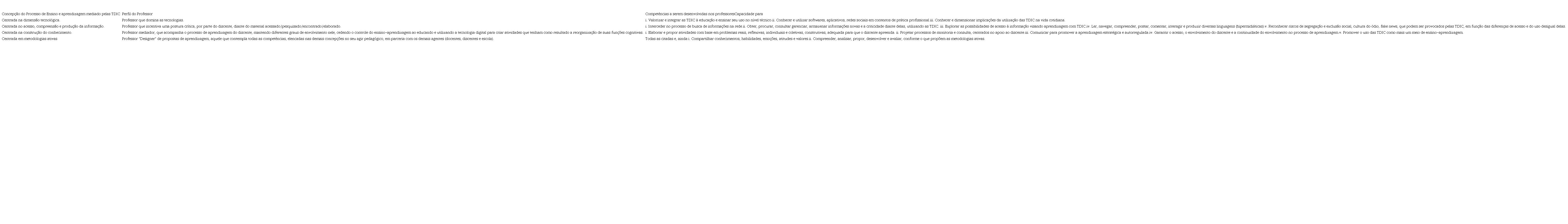 Assim, a partir da compreensão proposta por Mauri e Onrubia (2010) sobre o estado das competências que os docentes deveriam adquirir para conseguir integrar as TDIC à educação, às suas práticas pedagógicas, elaboramos o Quadro 1. Ele nos dá uma visão globalizante das diferentes concepções do processo de ensino e aprendizagem com as TDIC, relacionada ao papel e às competências necessárias ao professor. Ele sintetiza o processo de ensino e aprendizagem mediado pelas TDIC a partir de três âmbitos: i) Concepção do Processo de Ensino e Aprendizagem mediado pelas TDIC, ii) Perfil/papel do Professor, iii) Competências a serem desenvolvidas nos professores.