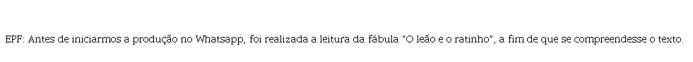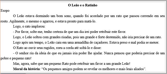 Para este relato de experiência, selecionamos o trabalho de uma das equipes, composta por três professores em formação (doravante Equipe de Professores em Formação - EPF), utilizando como critério os argumentos apresentados em relação aos recursos coesivos utilizados para a construção de um texto imagético coerente. O gênero textual escolhido pela equipe foi a fábula “O leão e o ratinho”, de autoria de Esopo, reproduzida a seguir de duas formas: linguagem verbal escrita e linguagem visual/ imagética.