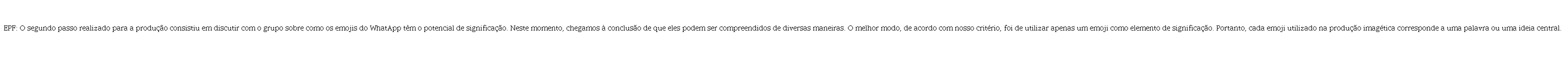 A solução encontrada pela equipe reforça o que Caiado, Fonte e Barros (2018) e Fonte, Barros e Caiado (2019) denominaram de coesão do tipo “conexão por contiguidade temporal e/ou espacial”, pois os espaços entre as linhas seriam marcadores sequenciais, funcionando como recurso coesivo para o texto imagético. Outro recurso utilizado pela equipe para tornar o texto imagético mais compreensível foi o estabelecimento de sinonímia e antonímia9 entre as imagens, emojis, ou seja, a EPF demonstrou capacidade de gestão, envolvimento e controle do processo de aprendizagem, auxiliado pelas TDM, compreendida neste processo enquanto mais um meio de ensino e aprendizagem.