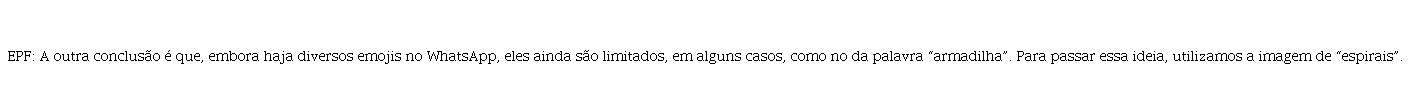 A EPF, diante da limitação dos emojis apropriados para dar significação ao texto imagético, realizou uma “associação coesiva”10 para estabelecer a ideia de “armadilha”, selecionando uma imagem em "espiral", estabelecendo, dessa maneira, uma relação semântica entre a ideia de “armadilha” e a imagem de “espiral”, conforme propõem Caiado, Fonte e Barros (2018) e Fonte, Barros e Caiado (2019).