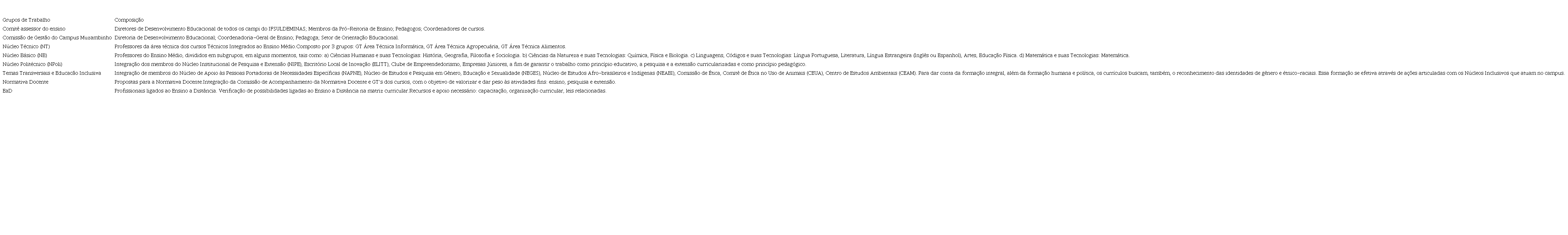 O primeiro passo foi a formalização da criação de Grupos de Trabalho (GTs) (Quadro 1) com suas respectivas competências que trabalharam no processo de estudo dos fundamentos e da legislação vigente, adotando-se sobretudo a Lei nº 11.892, de 29 de dezembro de 2008, que instituiu a Rede Federal de Educação Profissional, Científica e Tecnológica, cria os Institutos Federais de Educação, Ciência e Tecnologia, e dá outras providências; e o parecer CNE/CEB Nº: 11/2012, que deu origem à Resolução CNE/CEB 06/2012, que normatiza a educação profissional e os cursos técnicos. Cerca de 100 profissionais foram envolvidos na reformulação dos PPCs dos três cursos, incluindo professores e técnicos administrativos em educação do Campus Muzambinho.