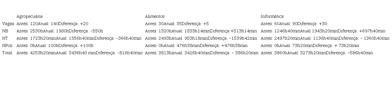 (d) Maior espaço para organização, capacitação e reciclagem dos docentes: a expectativa é que haja por parte dos docentes um maior aproveitamento dos períodos sem aula (dada à redução) para encontros semanais de ajustes e debates pedagógicos que envolvam os referidos cursos. Além de aplicação de projetos de ensino e aprofundamento dos conteúdos.