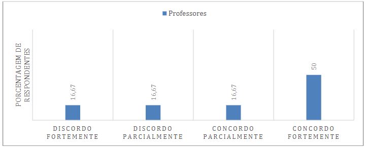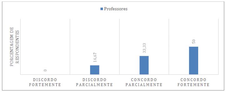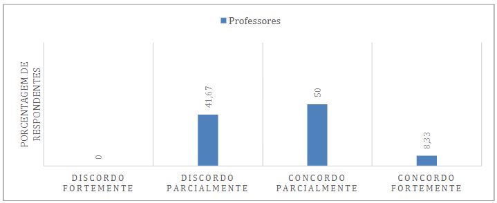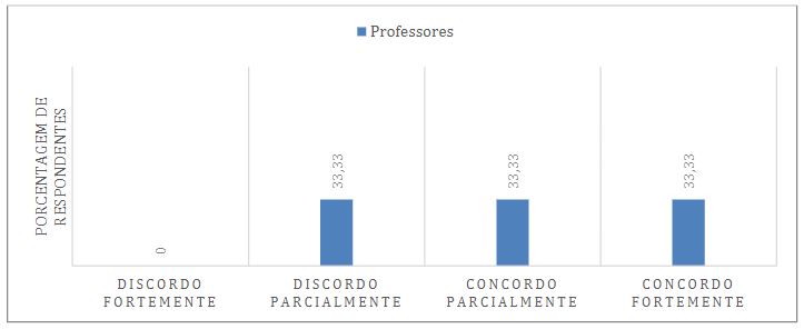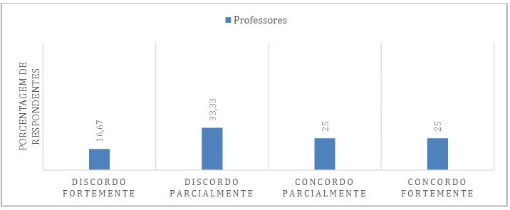Sobre a mesma dimensão, a Figura 3 representa a percepção dos professores sobre a contribuição do sistema de avaliação para o desenvolvimento dos estudantes. Dos professores respondentes, 50% encontram-se entre “discordo parcialmente” (16,67%) e “concordo parcialmente” (33,33%) que o sistema de avaliações contribui para o desenvolvimento dos estudantes. Os resultados sugerem algum grau de insatisfação dos docentes em relação ao sistema de avaliação. Neste sentido, Grisa e Ferrari (2016), argumentam que a avaliação depende dos interesses e objetivos da escola, e também deve respeitar princípios e critérios refletidos coletivamente pelos professores e presentes no projeto político pedagógico da instituição.