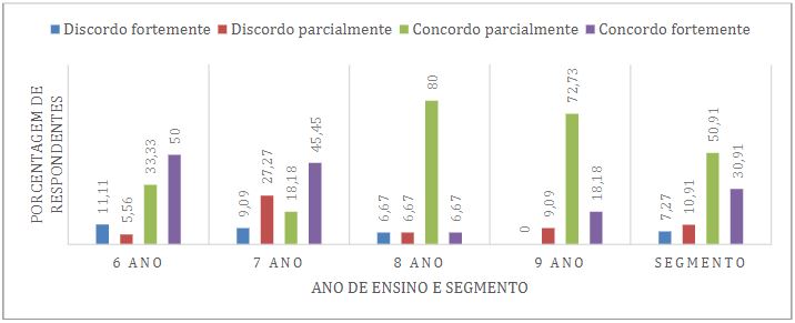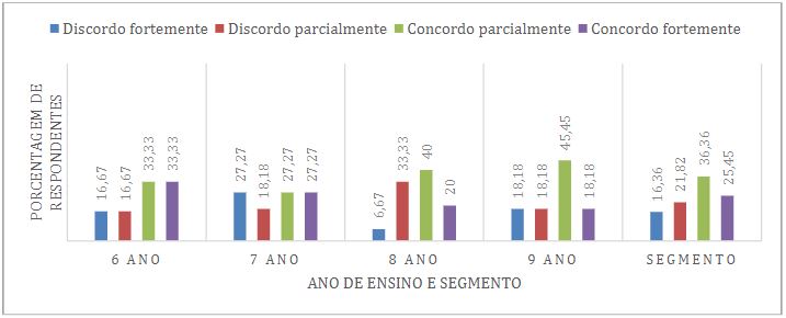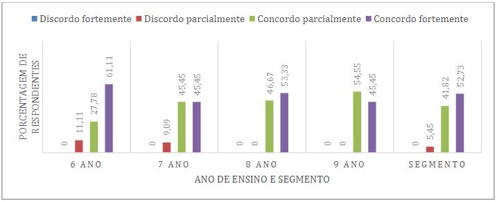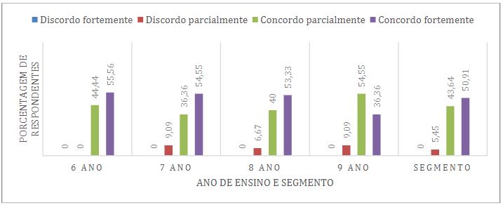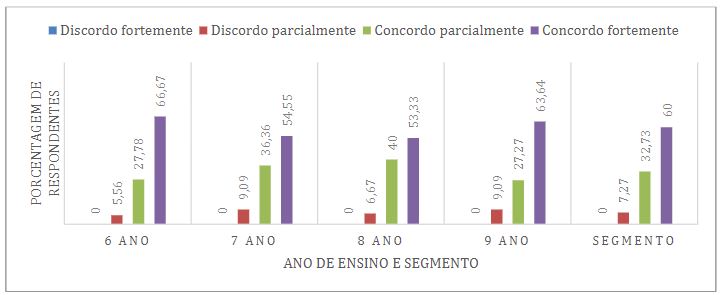 Sobre a dimensão 4, na Figura 8 pontua-se que a insatisfação dos estudantes com as aulas é um ponto de atenção para o segmento, já que 61,81% dos responsáveis estão entre “concordo parcialmente” (36,36%) e “concordo fortemente” (25,45%) em relação aos estudantes demonstrarem direta ou indiretamente insatisfação com as aulas. Além disso, observa-se que estes resultados se acentuam no 6º e 9º ano. Para estes anos em particular, destaca-se o trabalho de Silva e colaboradores (2019), que propuseram ações pedagógicas para o combate da evasão escolar com projetos para o acompanhamento da transição entre os segmentos como ação preventiva, visto que as mudanças acadêmicas e, por vezes, institucionais, podem impactar significativamente na vida do estudante.
