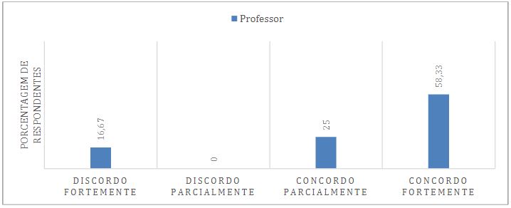 Relativo à quarta dimensão, na Figura 9 tem-se que na visão dos docentes 66,66% estão entre “concordo fortemente” (33,33%) e “concordo parcialmente” que os estudantes são engajados em suas aulas. Por um lado, temos a percepção dos responsáveis que veem os estudantes insatisfeitos com as aulas e, por outro, os professores, que percebem os estudantes como engajados. O resultado pode derivar de diversas situações, como uma insatisfação local, relativa a uma ou mais disciplinas, ou situacional, relativa ao ensino não presencial devido à pandemia da COVID-19.