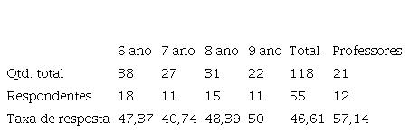 Por fim, na terceira etapa, realizou-se uma pesquisa descritiva de campo com os professores e com os responsáveis dos estudantes matriculados nas turmas dos anos finais do ensino fundamental. Na concepção de Gil (1999), a abordagem descritiva tem como principal objetivo descrever características de determinada população ou fenômeno e estabelecer relações entre as variáveis. Inicialmente, decidiu-se, junto à direção da instituição, a forma de coleta dos dados e as etapas de divulgação da pesquisa. Sobre a coleta de dados, foi enviado para cada categoria de respondente (responsáveis dos estudantes e professores) um formulário. A fim de obter dados mais precisos, decidiu-se elaborar um formulário para cada ano de ensino para as famílias dos estudantes e, tanto para as famílias quanto para os professores, lhes foi comunicado que as respostas seriam anônimas. Referente à divulgação da realização da pesquisa para as famílias dos estudantes, foram realizadas três etapas ao longo de três semanas consecutivas, compreendendo o mês de agosto do ano de 2021. Na primeira semana foi enviado um comunicado oficial para o e-mail dos responsáveis dos estudantes explicando a relevância da pesquisa para a instituição, juntamente com os links de acesso aos formulários para a coleta de dados. Na segunda semana, a direção e a coordenação pedagógica entraram em contato com os responsáveis considerados próximos da instituição para que eles estimulassem os demais responsáveis a também participarem da pesquisa. E, por fim, na terceira semana, a orientação pedagógica entrou em contato por meio de WhatsApp com todas as famílias com uma versão sintetizada do primeiro comunicado e com os mesmos links de acesso aos formulários. Quanto à divulgação da realização da pesquisa para os professores, a coordenação pedagógica encaminhou um comunicado por meio do grupo de WhatsApp do segmento na primeira semana e reforçou individualmente a relevância da pesquisa ao longo das outras duas semanas. A Tabela 1 abaixo apresenta as taxas de resposta percentuais locais (por ano) e global (segmento) obtidas com a pesquisa com os responsáveis e com os professores do segmento.