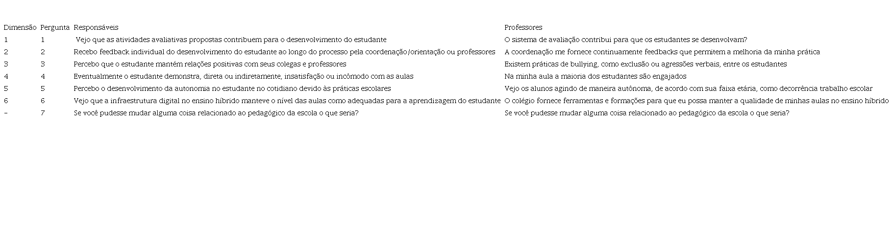 Os formulários enviados para cada categoria de respondentes apresentavam, em sua primeira página, o termo de consentimento livre e esclarecido (TCLE) e a pergunta “Você aceita participar da pesquisa?”, com as opções de “Aceito” e “Não aceito”. No caso de aceite, o formulário levava o respondente à próxima página, que continha cinco afirmativas e uma pergunta aberta. Para cada categoria de respondente foram elaboradas cinco afirmativas diferentes, mas cada uma delas se relacionava a uma mesma dimensão pedagógica, sendo elas: (1) Método avaliativo, (2) Acompanhamento da vida acadêmica, (3) Relacionamento com colegas e professores, (4) Qualidade das aulas, (5) Desenvolvimento da autonomia através das práticas pedagógicas e (6) Infraestrutura do ensino remoto. Já a pergunta aberta teve a intenção de coletar elementos que não foram compreendidos nas dimensões consideradas ou permitir ao respondente descrever com maior precisão alguma(s) de sua(s) resposta(s). A Tabela 2 abaixo apresenta as afirmativas elaboradas para cada categoria de respondentes e a pergunta aberta.