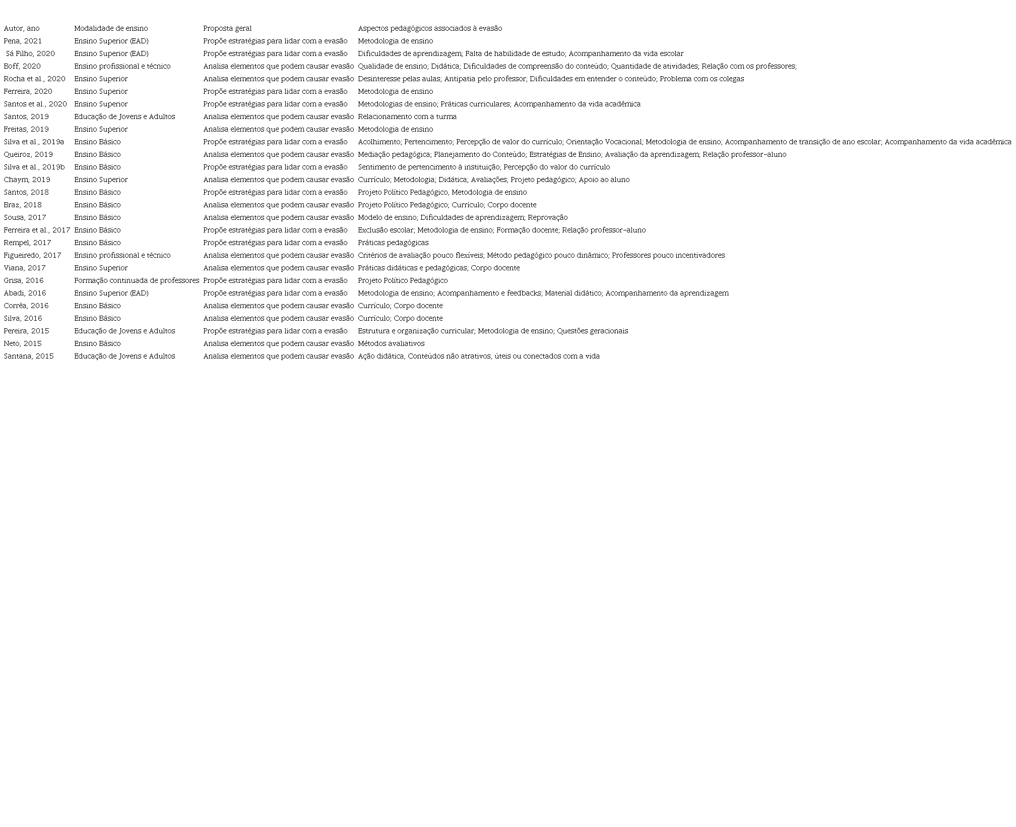 A base de dados final contém 26 artigos que foram lidos integralmente, e em cada artigo buscou-se identificar a proposta geral (propor estratégias para lidar com a evasão ou analisar elementos relacionados à evasão) e quais aspectos pedagógicos foram relacionados com a temática da evasão escolar. A Tabela 3 abaixo apresenta esses dados compilados, em relação ao primeiro autor, ano, modalidade de ensino, a proposta geral do artigo e quais aspectos pedagógicos foram associados à evasão no trabalho.