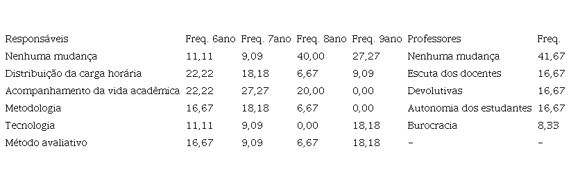 Sobre as categorias identificadas entre os professores, duas já constavam na pesquisa (devolutivas pela coordenação e desenvolvimento da autonomia dos estudantes) e três são inéditas. Referente a essas categorias, os professores apontam a necessidade de um processo estruturado de devolutivas sobre sua prática e uma necessidade de desenvolver a autonomia dos estudantes dentro dos processos da instituição. Sobre as categorias inéditas, os docentes indicam a necessidade de a instituição ter uma escuta maior, e mais ativa, de suas propostas, e a necessidade de o corpo docente ser partícipe das decisões institucionais. Em outra categoria, burocracia, emerge-se a necessidade de se revisar quais documentos são efetivamente necessários para a condução da prática pedagógica e para a documentação escolar e quais são desnecessários.