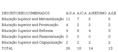 A representação dos aspectos que sistematizam a tabela explicita-se da seguinte forma: A/S.A (Artigo Sem Aspas); A/C.A (Artigos Com Aspas); A/Resumo (Análise do Resumo); A/LE (Artigos para Ler). Nessa acepção, no entrecruzamento entre Educação superior and mercantilização coletamos 11 artigos, contudo, com primeiro filtro (A/C.A), resultou em 7 artigo, com o refinamento do resumo esse número reduziu para 6 artigos selecionados para leitura, isto é, 54,5% dos achados foram validados. No entrecruzamento entre os descritores educação superior and privatização coletamos 4 artigos, contudo, após todo o processo de refinamento obteve-se 2 artigos, ou seja, 50%. Na combinação entre educação superior and reforma obtemos 9 achados, após refinamento foram validados 3, percentual (33,3%). No entrecruzamento educação superior and financeirização não foi obtido nenhum artigo na pesquisa geral. Por conseguinte, na combinação educação superior and oligopolização, apenas 2 artigos foram coletados, todos foram validados (100%). Nesse sentido, dos 26 achados dessa categoria temática, apenas 13 foram validados (50%).