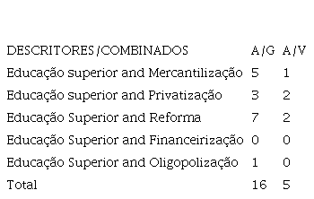 No exame da tabela 2, inicialmente combinamos os descritores educação superior and mercantilização: o total de achado inicial foi de 5 artigos, contudo, após refinamento validamos apenas 1 (20%). No entrecruzamento educação superior and privatização coletamos 3 artigos, com o refinamento 2 artigos foram validados (66,7%). Ademais, na pesquisa combinada entre educação superior and reforma, foram gerados 7 achados, no entanto, somente 2 tiveram validação (28,6%). No entrecruzamento entre os descritores educação superior and financeirização não obtivemos resultados. Por fim, na busca dos combinados educação superior and oligopolização, um artigo foi gerado, contudo, não foi validado.