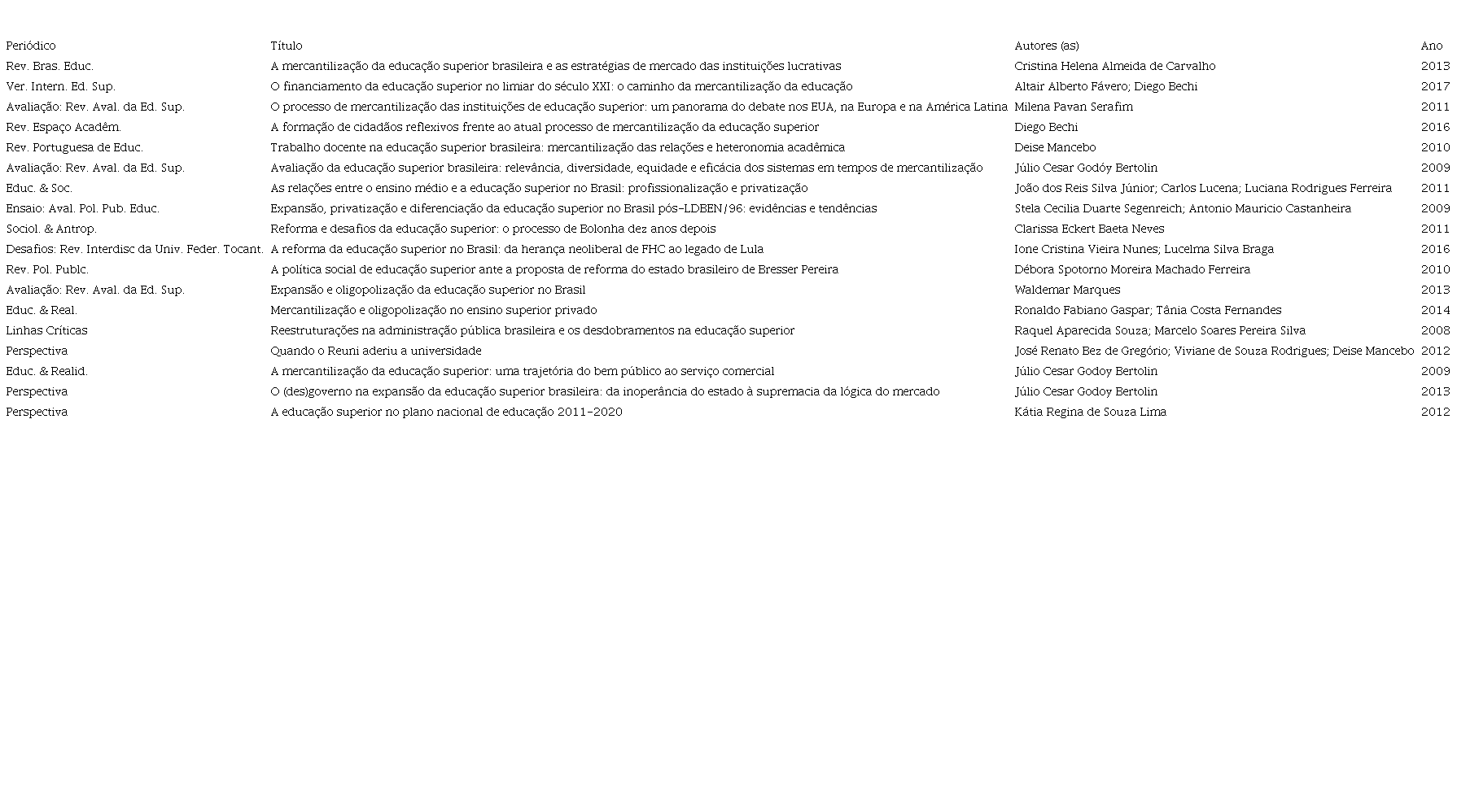 Como referenciar este artigo: DE PAULA, A. S. N. A expansão mercantil da educação superior como tema da produção do conhecimento nos periódicos no Brasil (2008-2018). Revista Ibero-Americana de Estudos em Educação, Araraquara, v. 17, n. 2, p. 1231-1245, abr./jun. 2022. e-ISSN: 1982-5587. DOI: https://doi.org/10.21723/riaee.v17i2.14730