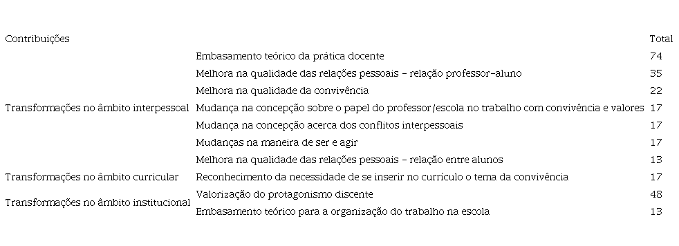 As transformações ocorridas no âmbito interpessoal concernem àquelas que inferem diretamente na maneira de ser e de fazer dos educadores e na relação que estabelecem com os alunos. A mais expressiva, citada por 74% dos sujeitos, foi o embasamento teórico da prática docente. Eles reconheceram que, diante das lacunas existentes em sua formação, o embasamento teórico advindo da formação realizada durante o programa influenciou suas práticas, tornando-os mais seguros para lidar com os problemas de convivência e intervir nos conflitos.