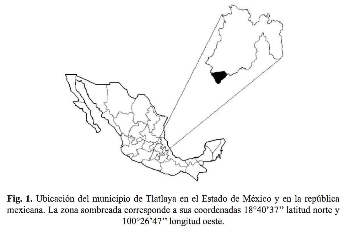 El municipio de Tlatlaya está ubicado en la porción sur del Estado de México (fig. 1), en la provincia fisiográfica depresión del Balsas, sus coordenadas extremas son: máxima 18°40’37’’ latitud norte y 100°26’47’’ longitud oeste; mínima 18°21’57’’ de latitud norte y 100°04’07’’ de longitud oeste; la altitud varía entre 600 y 1850 m. La orografía está definida por formaciones montañosas irregulares, barrancas profundas y valles pequeños. Los principales tipos de suelo son Cambisol, Feozem, Litosol y Regosol. La vegetación predominante es bosque tropical caducifolio, bosque de Quercus, bosque de Pinus y bosque mixto de Quercus - Pinus (Sánchez-Landa, 1985; Cardoso-Santín, 1999).