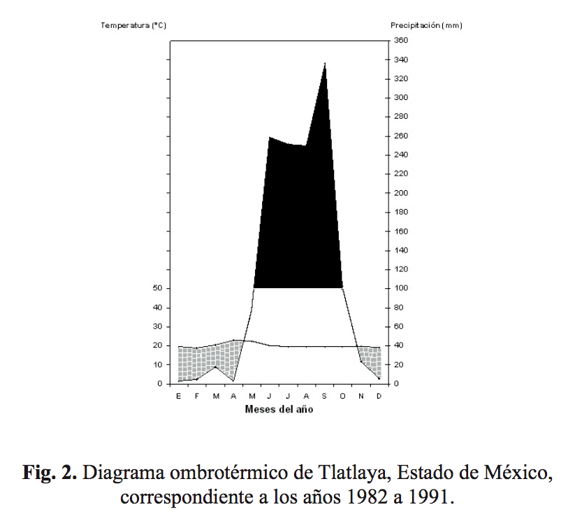 Se estudiaron dos cañadas situadas más o menos a 1 y 2 km al sur de la cabecera municipal de Tlatlaya, sobre el camino Tlatlaya-Las Parotas. De acuerdo con García (1981), esta zona presenta un clima Aw(w) (i) g (cálido subhúmedo con lluvias en verano), la precipitación media anual es de 111.2 mm con un máximo de 336.5 mm en septiembre y un mínimo de 3 mm en enero. La temperatura media anual es de 20.1°C, la máxima se presenta en abril, con 23.1°C y la mínima de 18.8°C se registra en febrero. El diagrama ombrotérmico de Tlatlaya (fig.2) (Martínez-De La Cruz, 2005), muestra los promedios mensuales de temperatura y precipitación registrados por la Comisión Nacional del Agua con datos correspondientes a un periodo de diez años (1982-1991).