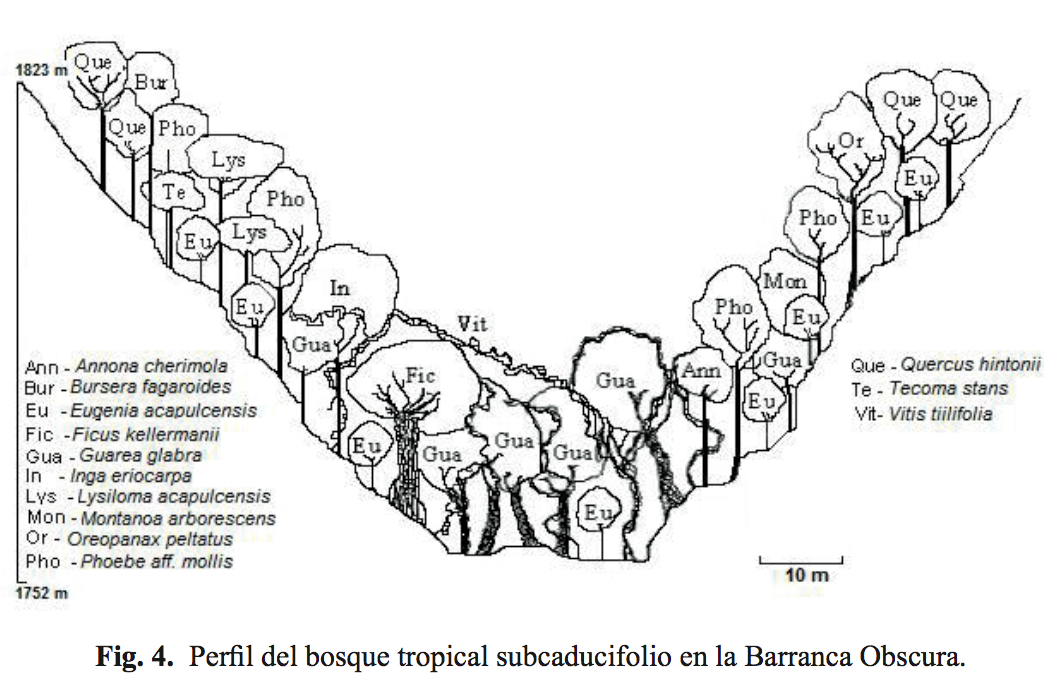 La Barranca Obscura, se ubica a aproximadamente 4 km al sur de la cabecera municipal de Tlatlaya en las coordenadas 18° 37’ latitud norte y 100° 14’ 20” longitud oeste. La cañada tiene una dirección noreste-suroeste con una profundidad promedio de 71 m con respecto a la ladera noroeste, la ladera sureste tiene el doble de altura y a partir de los 1 810 m se encuentra la línea de pinos y encinos. Las laderas presentan pendientes de 40° y de 40% de roca expuesta. En el fondo de la cañada corre un arroyo solamente en la época de lluvias. El BTS en la cañada presenta un estrato superior máximo de 42 m. En el estrato arbóreo pueden identificarse tres subestratos con alturas promedio de 30.15 m para el estrato superior, 14 m para el estrato intermedio y 5.55 m para el estrato inferior. El fondo de la cañada mide aproximadamente 20 m; resulta más ancho que el de Agua Fría, lo que permite el establecimiento de árboles. En la parte superior de la cañada dominan los encinos, mientras que en las partes media y baja se encuentran géneros como Annona, Eugenia, Ficus, Guarea, Inga, Montanoa y Phoebe (fig. 4). Las especies trepadoras pertenecen a las familias Dioscoreaceae, Fabaceae y Malpighiaceae; las lianas están representadas por Vitis tiliifolia y como epífitas se encuentran especies de las familias Bromeliaceae, Orchidaceae y Piperaceae. El estrato arbustivo y herbáceo está poco desarrollado y presenta especies de las familias Adiantaceae, Araceae, Asteraceae, Fabaceae, Lamiaceae, Moraceae y Piperaceae.