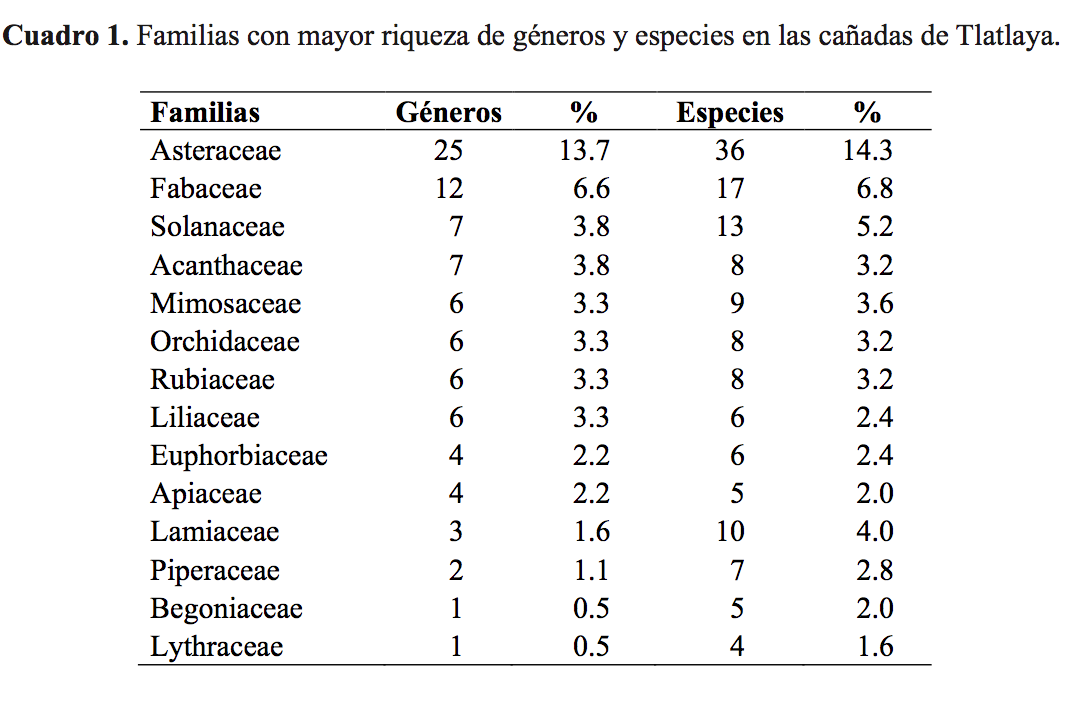 Las familias mejor representadas en cuanto al número de géneros y especies son 14 y en su conjunto comprenden 49.2% del total de los géneros y 56.6% de las especies de la Cañada de Agua Fría y Barranca Obscura del municipio de Tlatlaya (cuadro 1).