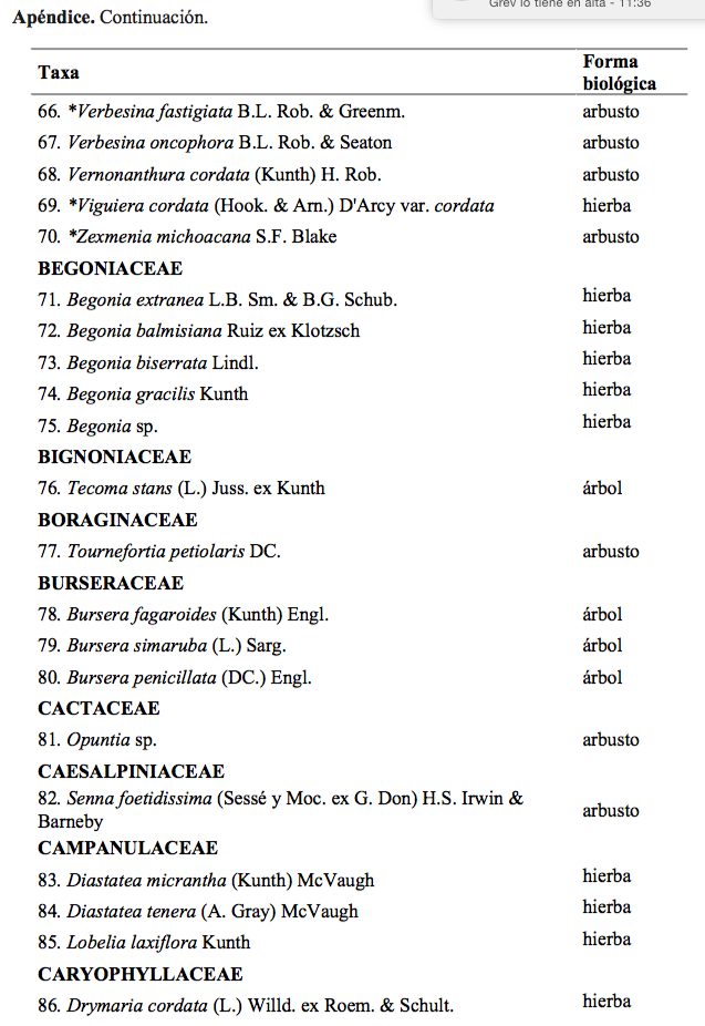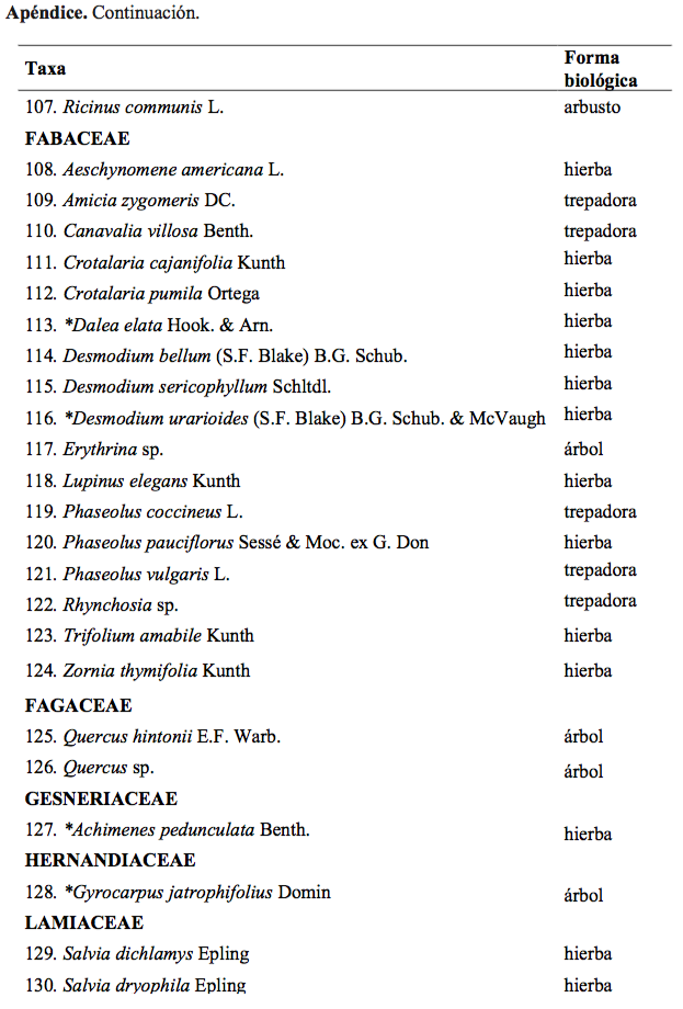 La descripción de las formas de crecimiento empleada fue hierba, arbusto y árbol, según Calderón de Rzedowski y Rzedowski (2001). Para las hierbas se distinguieron además las siguientes categorías: epífitas, trepadoras y rastreras.