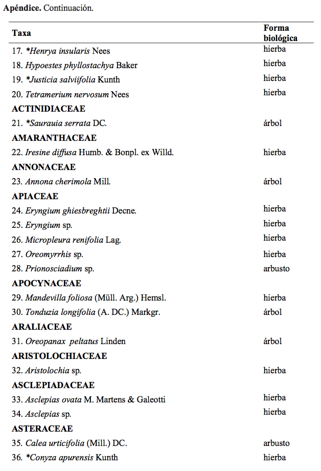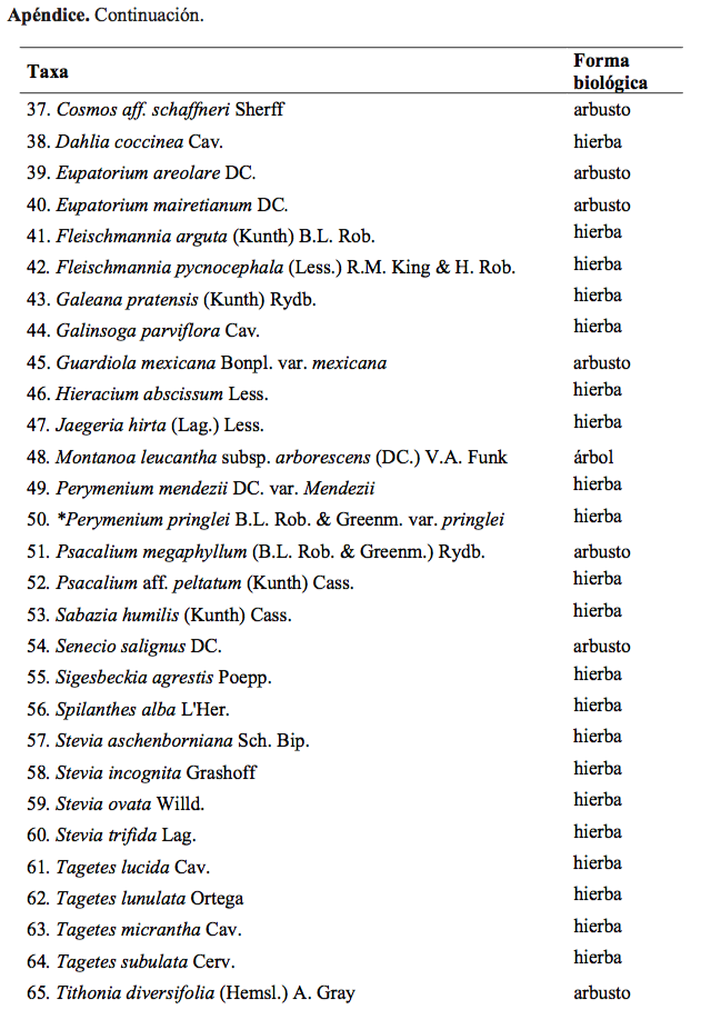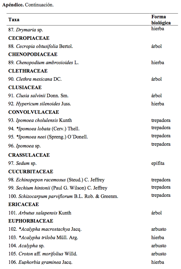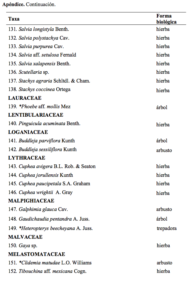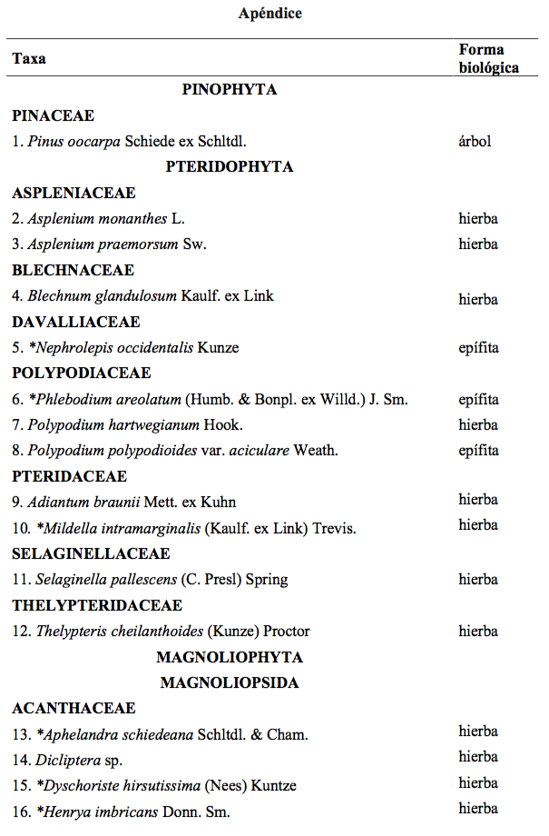 En el apéndice se presenta una lista de plantas con su forma de crecimiento, las familias se ordenaron alfabéticamente de acuerdo con el sistema de clasificación para angiospermas propuesto por Cronquist (1981), mientras que el sistema de Cronquist, Takhtajan y Zimmerman (1966) se utilizó para Pteridofitas y Gimnospermas. Las abreviaturas de los autores de las especies se estandarizaron mediante el catálogo de autores de plantas vasculares de México sugerido por Villaseñor (2001). En el mismo cuadro se indican las especies no registradas con anterioridad para el Estado de México.