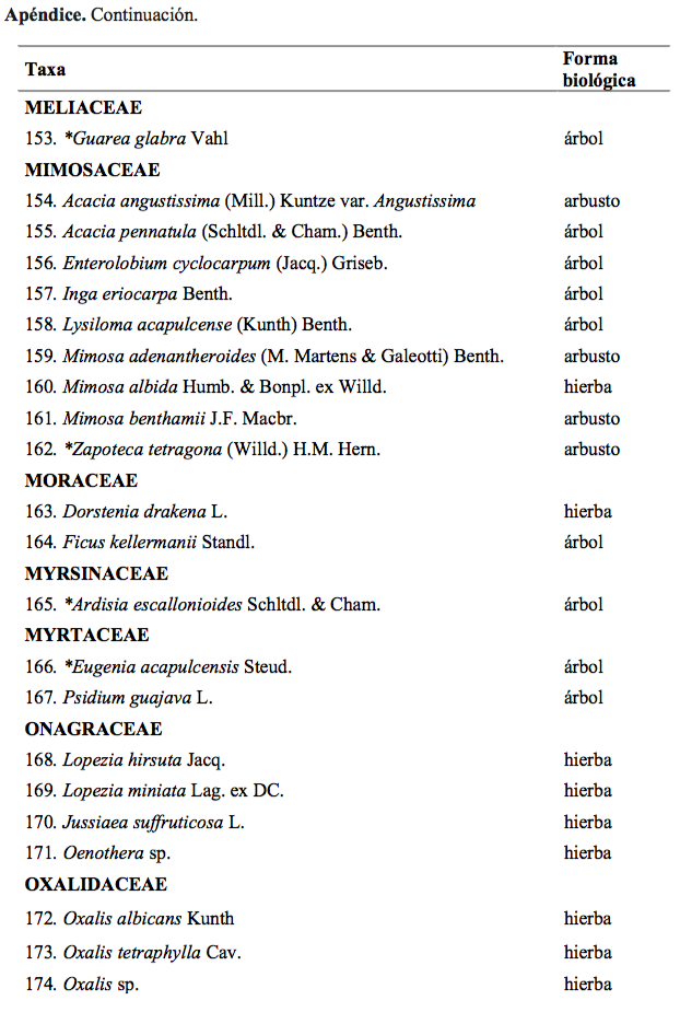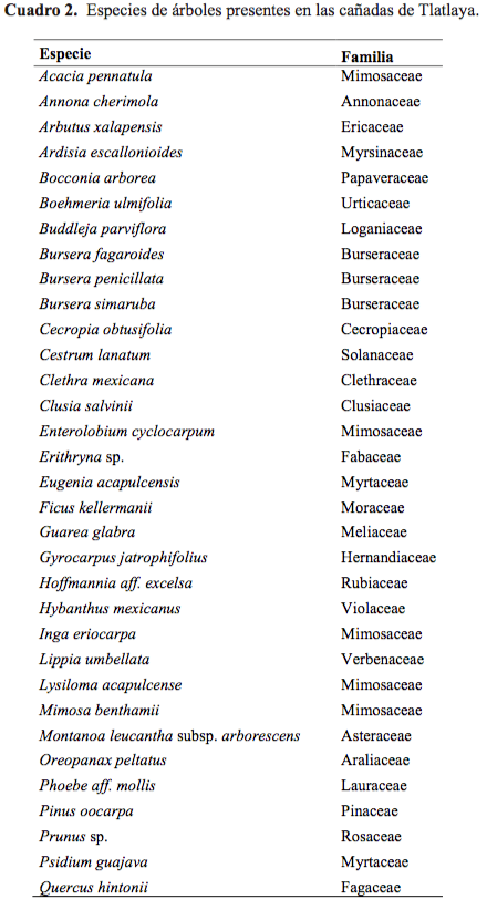 Por otra parte, ciertas especies de estas cañadas se comparten con las de otras áreas con Bosque Tropical Caducifolio en la Cuenca del Balsas (Rzedowski, 1978; Guizar-Nolazco, 1983; Torres-Zúñiga, 1991; Zepeda-Gómez y Velázquez-Montes, 1999; López-Sandoval, 2001), Bosque Mesófilo de Montaña (Torres-Zúñiga, 1991; López-Pérez, 1995), Bosque de Pinus y Bosque de Quercus - Pinus (Rzedowski, 1978; Guizar-Nolazco, 1983; Torres-Zúñiga, 1991); lo que indica que los taxa como Annona cherimola, Arbutus xalapensis, Clethra mexicana, Inga eriocarpa, Lysiloma acapulcense, Tecoma stans, y Trema micrantha pueden formar parte de ensambles diferentes, con dinámicas poblacionales propias. Es de señalarse también, que Eugenia acapulcensis y Guarea glabra dominantes en las cañadas, están presentes en comunidades de Bosque Tropical Perennifolio (Ibarra-Manríquez y Sinaca, 1995, 1996).
