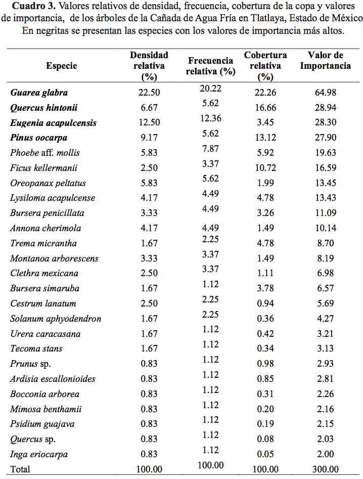 En el cuadro 2 se muestran las 42 especies de árboles que crecen en la zona, agrupadas en 39 géneros y 30 familias, éste es un sitio con gran riqueza florística que presenta una mezcla entre elementos de bosque templado ( Pinus y Quercus ) y bosque tropical.