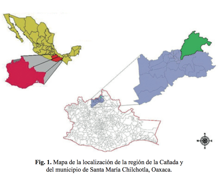 Santa María Chilchotla es uno de los municipios que conforman la Región de la Cañada en el estado de Oaxaca, pertenece al distrito de Teotitlán de Flores Magón (fig. 1). Se encuentra al noreste de la capital del estado, se localiza a 18° 13´ 56´´ latitud norte y a 96° 49´45´´ longitud oeste, a una altitud de 1400 m s.n.m. en la cabecera municipal, pero oscila entre los 150 y 1 960 m s.n.m. El municipio al sur colinda con San José Tenango y Huautla de Jiménez; al norte el estado de Veracruz; al sur con San Antonio Eloxochitlán y el estado de Puebla.