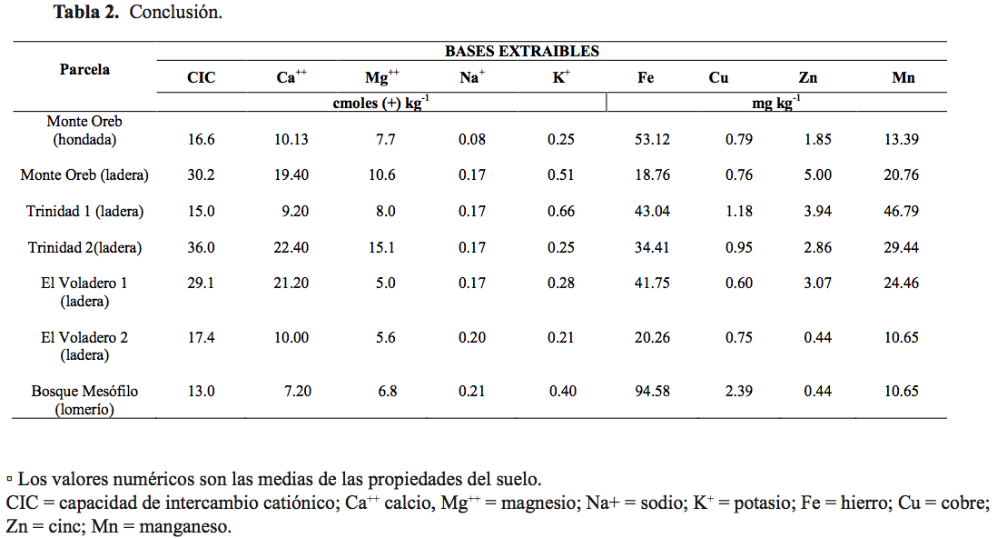 Vergara-Sánchez et al. (2005), trabajaron tres regiones: la mazateca, la cuicateca y la mixe, donde había un antecedente del Proyecto Manejo Sustentable de Laderas (PMSI) (Vergara et al., 2004) citado por ellos. En sus resultados reportan particularmente para la zona mazateca de nuestro interés, pH muy ácido de 5.2, lo cual lo atribuyen a la escasez de bases intercambiables (Na, K, Ca y Mg) y a la presencia de aluminio intercambiable. En suelos de la región mazateca se encontró la mayor cantidad de sodio intercambiable (0.28 cmoles(+) kg-1), pero no es un problema, por otro lado Ca, Mg, K y fósforo asimilable fueron valores bajos, en materia orgánica son muy ricos de 6.4% (a la profundidad de 40 cm), concluyen que estos suelos presentan serias restricciones químicas que limitan los rendimientos de los cultivos.