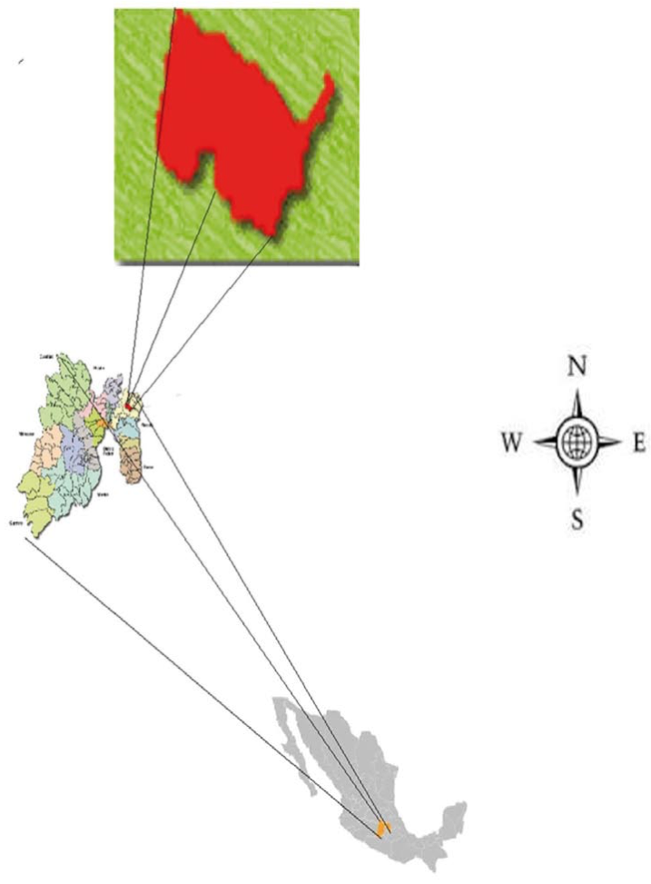 Asimismo, el nombre de Santiago Tepetitlán proviene del náhuatl tepetl, que significa cerro o sierra; ti, sílaba de ligadura eufónica; y tlan, entre: “lugar entre cerros”. Forma parte del municipio de San Martín de las Pirámides y es el más lejano, ya que se encuentra separado por los municipios de Teotihuacán, Otumba y Tepetlaoxtoc, su distancia a la cabecera municipal es de 18 kilómetros (Robelo, 1974). Se localiza al noreste del Estado de México, entre los paralelos 19° 37’ 40” y 19° 63’ 77” de latitud norte y a los 98° 45’ 40” y 98° 81’ 72” de longitud oeste, (INEGI, 2006 ), a 2 380 m snm (fig. 1). De acuerdo al Censo de población y vivienda el municipio cuenta con una población de 24851 habitantes (INEGI, 2010).