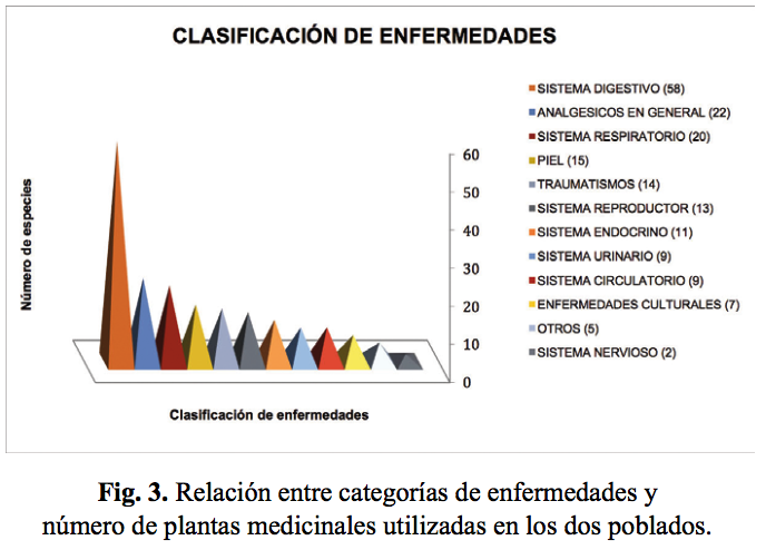 Clasificación de enfermedades y especies utilizadas (fig. 2). Dentro de las enfermedades frecuentes que padece la población resaltan las que afectan al sistema digestivo (principalmente dolor de estómago, vómito y diarrea), para lo cual se utilizan 57 especies, que corresponden al 30.48% del total lo cual coincide con otros estudios de plantas medicinales realizados (Hernández et al., 2005), en segundo lugar se tienen 25 especies (13.36%) como analgésicos en general, y en tercer lugar 19 especies (10.16%) para enfermedades de filiación cultural como el susto y el empacho, con 18 plantas (9.62%) con afección del sistema respiratorio como la tos, que también se destacan con altos porcentajes de uso en otras localidades del país (Nepomuceno e Ishihara, 2010), las relacionadas con la piel 17 plantas (9.09%) y las que se usan para traumatismos, (golpes y heridas) con 12 especies (6.4%); y en menor proporción el grupo de plantas que sirven para problemas urinarios, circulatorios, reproductivos, endócrinos, nerviosos.