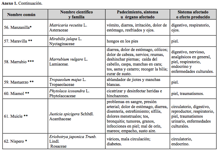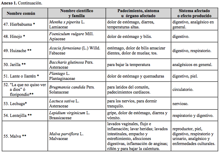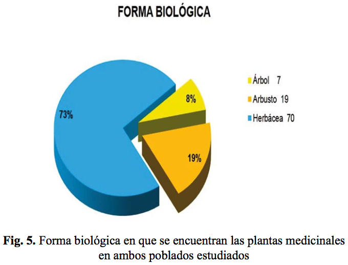 Forma biológica y familias botánicas . Las 96 especies medicinales registradas, presentan tres tipos de forma biológica: en primer lugar las herbáceas con 70 especies representando el 72%, en segundo lugar los arbustos con 19 especies en un 19% y árboles con siete especies en un 8%. Estas 96 especies medicinales pertenecen a 46 familias botánicas, siendo las Asteraceae las dominantes con el 45.6%, Solanaceae 15.2%, Amaranthaceae y Lamiaceae 10.8% y Apiaceae y Fabaceae 8.6% del total, el resto pertenece a diferentes familias mostradas en el anexo 1.