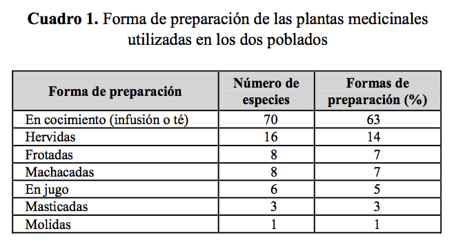 Formas de preparación y vías de administración. Son siete las formas de preparación de las plantas medicinales que utilizan los habitantes de los dos poblados (cuadro 1), destaca en primer lugar el cocimiento o té (63%), el cual se ingiere o se usa en forma de lavados y baños; en segundo lugar las hervidas (14%), seguido de las frotadas (7%) que se administran friccionando sobre el lugar afectado; las machacadas (7%) de aplicación local, directamente ya sea en piel o fosas nasales, y otras (9%) que se ingieren en jugo, masticadas o molidas.