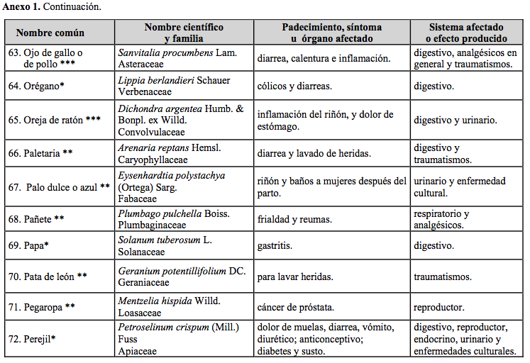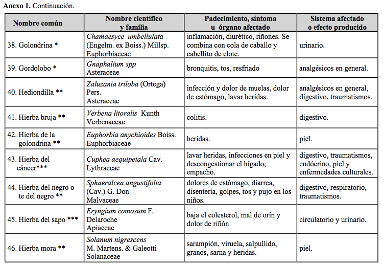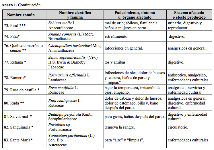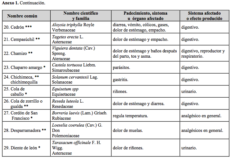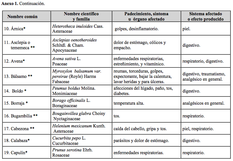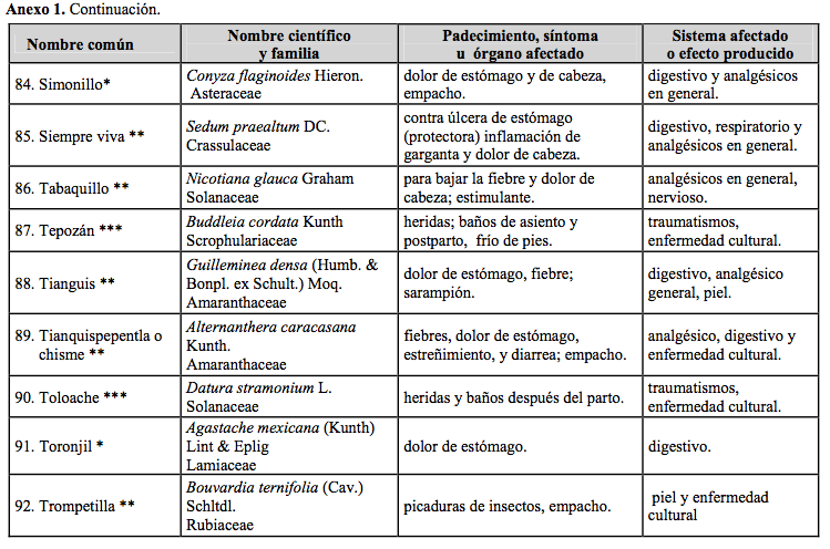 El anexo1 presenta el total de las plantas medicinales, se incluyen los padecimientos que son tratados con éstas, el nombre común, nombre científico y familia botánica de las 96 especies registradas. Además, contiene las categorías en que se ubican las plantas según el uso que se les da con base en la Clasificación Internacional de Enfermedades (CIE) y problemas relacionados con la salud de la OMS en 1972 (OMS, 1995) y del Instituto Mexicano de Medicinas Tradicionales (Tlahuilli, 1997). En este anexo se destaca con un asterisco las plantas que sólo se registraron en la cabecera municipal de San Martín de las Pirámides, con dos asteriscos las que se localizaron sólo en Santiago Tepetitlán y con tres asteriscos las que fueron encontradas en ambas localidades.
