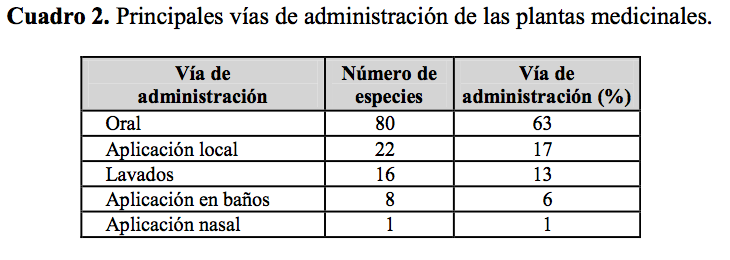 En cuanto a las vías de administración de las plantas medicinales, sobresale la vía oral (63%), aplicación local (17 %) la aplicación de lavados (17%) cabe hacer mención que el número de especies es diferente al total registrado debido a que existen varias especies que presentan más de una forma de preparación y de administración.