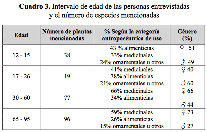 Sin embargo estos datos son un indicador de que el conocimiento sobre el uso de plantas medicinales se sigue transmitiendo y que los habitantes muy jóvenes poseen menos conocimiento.
