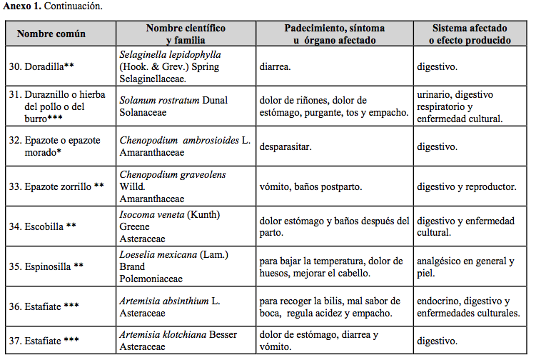 La familia Asteraceae tiene gran importancia medicinal en Santiago Tepetitlán y en la cabecera de San Martín de las Pirámides, entre las que destacan cabezona ( Helenium mexicanum H.B.K.), chamiso ( Viguiera dentata (Cav.) Spreng.), zoapatle ( Montanoa tomentosa Cerv.), ajenjo (A rtemisia laciniata Willd.), entre otras (anexo 1). De esta familia, el peshto ( Brickelliaveronicifolia (H.B.K.) A. Gray) se utiliza para el sistema digestivo por tener propiedades coleréticas y colagogas (Martino et al., 1989, Palacios-Espinosa et al., 2008), o el gordolobo ( Gnaphalium spp) se usa para afecciones del sistema respiratorio (Wei-Cai et al., 2011).