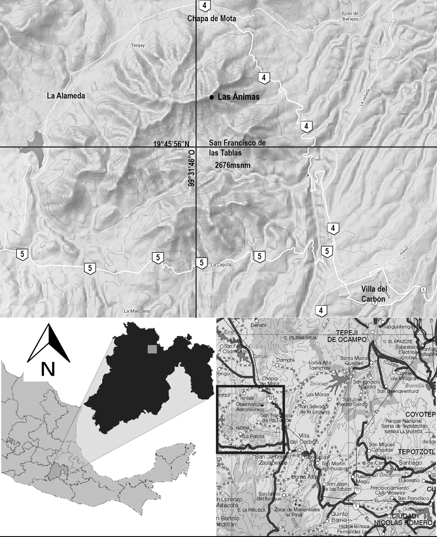 Ubicación: El municipio de Chapa de Mota se localiza en la porción noroccidental del Estado de México, entre los paralelos 19° 43’ 57’’ y 19° 54’ 15’’ de latitud norte y los meridianos 99° 25’ 13’’ y 99° 40’ 15’’ de longitud oeste, con un intervalo de altitud entre 2 600 m en el poblado hasta 3 070 en la cima del cerro Las Ánimas (INEGI, 2010). El municipio cuenta con una superficie de 28949 hectáreas, 1.29% del territorio estatal; se divide en 38 localidades y su población es de 21.746 (en 2005) habitantes. La sierra de Las Ánimas se ubica al sur de la cabecera municipal y al noroeste del poblado de Villa del Carbón. Las vías de acceso son, a partir del noroeste de la Ciudad de México por la estatal núm. 5 (Atizapán de Zaragoza-Villa Nicolás Romero), se circula hasta el poblado de Villa del Carbón; unos cuatro kilómetros al norte se divide en dos: a) la estatal 5 continua por el sur de la sierra de Las Ánimas hasta el poblado de Tecoac y b) la estatal núm. 4 (13) llega a Chapa de Mota. A partir de estas rutas, existen numerosas brechas y veredas que permiten llegar a los diferentes sitios de recolecta de ejemplares (fig. 1).