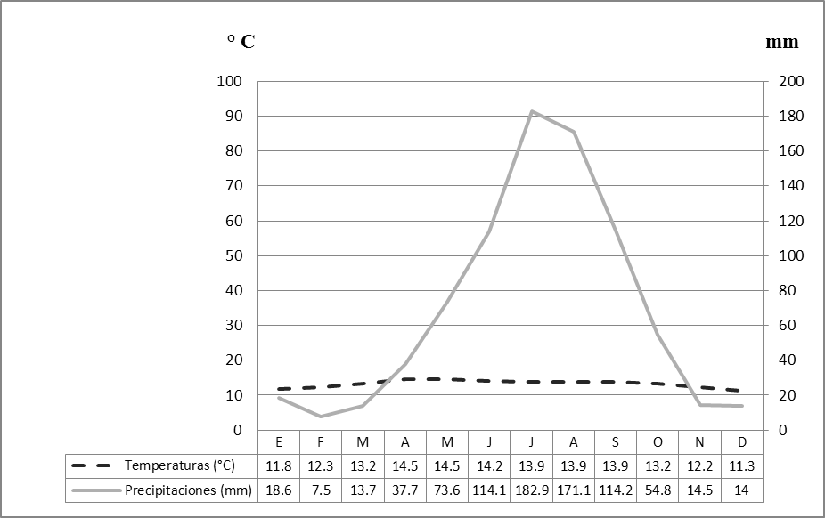 Clima: Por la posición geográfica, la altitud ya indicada y, dado que los vientos alisios son atajados por la Sierra Madre Oriental y parte de la Faja Volcánica Transmexicana, excepto en verano que logran penetrar al centro continental, el clima en la localidad es de índole templado subhúmedo de montaña tropical (Jáuregui-Ostos y Vidal-Bello, 1981). Según García (2004), la fórmula climática de la zona llana (presa Danxho y presa Taximay a 2 400 m al NNO y NE respectivamente) es templado subhúmedo, el intermedio de los subhúmedos con cociente P/T de 54, con lluvias en verano. La mayor cantidad precipita es en los meses de julio a septiembre (468.2 mm) y en invierno llueve menos del 10% del total anual. La temperatura promedio anual es de 13.2°C; los meses más cálidos son abril-mayo (14.5°C) y los más fríos en diciembre-enero (11.3°C): Cb(w1)(w)ig (fig. 2). En invierno el cociente P/T aumenta a 62 y suelen ocurrir de 20 a 40 días con heladas. Las tormentas eléctricas aparecen principalmente en el mes de agosto, la niebla se concentra entre noviembre y febrero (6-11 días al año) y el granizo (cinco días en promedio anual) cae con mayor frecuencia en el mes de agosto (Jáuregui-Ostos, 1981). Sin embargo, en la zona de la sierra, de acuerdo a los datos obtenidos de la estación meteorológica Chapa de Mota a 2 620 m snm (CONAGUA, 2011) (fig. 2), disminuye la temperatura con la altitud a ca. 11ºC y aumenta sensiblemente la precipitación (a 817 mm anual).