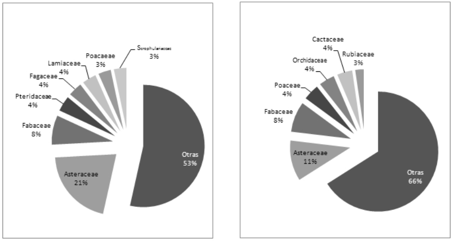 En la Sierra de las Ánimas, las familias representadas con 10 o más especies son siete y todas, excepto Fagaceae, son de las que presentan mayor número de especies en la flora de México (Villaseñor, 2003 y Mickel y Smith, 2004). Dentro de estas siete familias, las que presentaron mayor abundancia de especies y que coinciden en relación con el espectro normal reportado para México por Rzedowski (1991) son Asteraceae (56 spp.) y Fabaceae (21 spp.). A diferencia del normal mexicano, en la zona estudiada existe una alta representatividad de las familias Pteridaceae (24 spp.), Fagaceae (10 spp.), Lamiaceae (10 spp.), Poaceae (9 spp.) y Scrophulariaceae (9 spp.); este conjunto de familias son propias de los sistemas montañosos con clima templado subhúmedo del país (Rzedowski, 2006; Tejero-Díez y Arreguín-Sánchez, 2004), especialmente de la Faja Volcánica Transmexicana (fig. 3). (Martínez-Gordillo et al., 2013; Valencia-Avalos, 2004; Suárez Mota et al., 2013).