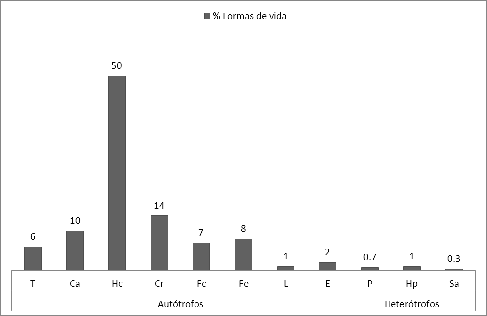Las formas de vida, es la expresión adaptativa de las plantas a las presiones que ejerce el medio ambiente. Entre los principales elementos que afectan a las plantas se encuentran la cantidad de agua precipitada, la duración de los periodos de lluvia y sequía, el tipo de suelo, la severidad de la tempe-ratura invernal y evidentemente, la actividad humana (fuego inducido, pastoreo, etc.) (Krebs, 1987). Por el tipo climático del área de estudio (templado subhúmedo), la forma de vida dominante es la hemicriptófita (50%), seguido de los criptófitos (14%) y caméfitos (10%); con menor número de especies y en orden descendente, se encuentran los fanerófitos escaposos (8%), fanerófitos cespitosos (7%), terófitos (6%), y lianas (1%). Las plantas corticícolas (epífitos) y las heterótrofas (saprofitas, hemiparásitas y parásitas) están escasamente representadas (2% cada grupo) (fig. 4).