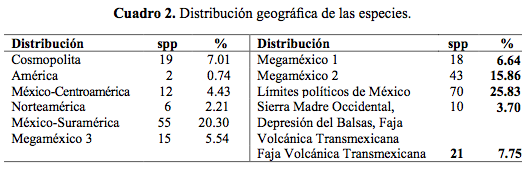 El 37.28% de las especies encontradas se distribuyen dentro de los límites políticos de México, de éstas 11.45% son endémicas regionales a alguna de las provincias fitogeográficas que coinciden con el área de estudio. Entre estas últimas destacan las pertenecientes a la Faja Volcánica Transmexicana (7.75%) y el resto de las especies (3.70%), combinan esta provincia con dos o más provincias limítrofes (tal como Altiplano Mexicana, Sierra Madre Occidental y/o Depresión del río Balsas). La mayoría de las especies reportadas (62.73%) tienen una distribución que rebasa los límites políticos de México; en este caso descuellan las de México-Sudamérica (20.30%) y las endémicas a Megaméxico 2 (15.86%). El resto de la flora corresponde a especies con alguna otra distribución extraterritorial (cuadro 2).